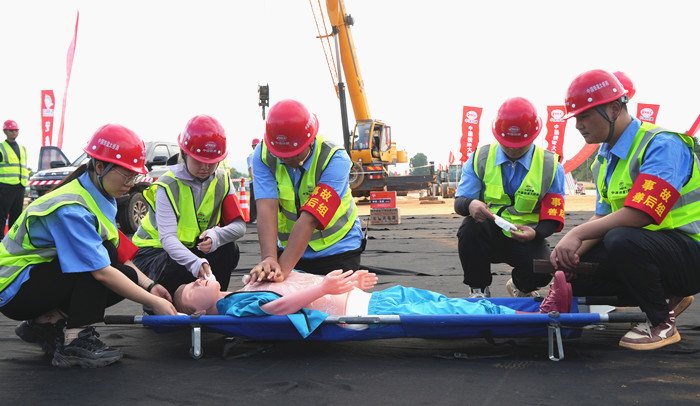 演練以 YQB1 標(biāo)施工現(xiàn)場為場景,模擬了兩類施工常見險情:一是起重機械作業(yè)時突發(fā)故障,吊物意外墜落導(dǎo)致工人受傷;二是施工人員在高溫環(huán)境下作業(yè),突發(fā)中暑癥狀。演練指令下達后,各應(yīng)急救援小組迅速啟動響應(yīng)機制,嚴(yán)格依照既定分工展開行動 ,從現(xiàn)場警戒、傷員初步救治,到信息上報、醫(yī)療轉(zhuǎn)運,整個過程銜接緊密、有條不紊。各小組之間高效配合、協(xié)同作戰(zhàn),最終在預(yù)定時間內(nèi)圓滿完成全部救援任務(wù),充分展現(xiàn)出項目團隊良好的應(yīng)急處置能力和默契的團隊協(xié)作精神。