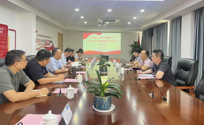 8月5日上午,中國(guó)進(jìn)出口銀行安徽省分行資深經(jīng)理兼三處處長(zhǎng)朱曉冬一行到訪(fǎng)安慶中安公司,雙方就融資合作及業(yè)務(wù)發(fā)展等事宜進(jìn)行座談交流。集團(tuán)公司黨委委員、副總經(jīng)理、安慶中安公司董事長(zhǎng)彭凱主持座談會(huì)。中安公司有關(guān)負(fù)責(zé)同志參加會(huì)議。